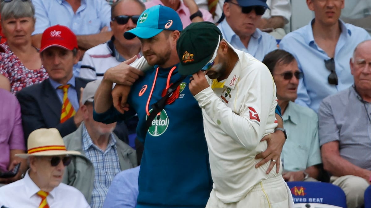 Nathan Lyon's future on the Ashes tour is uncertain after he arrived at Lord's on Friday on crutches, as the Australian camp reported the bowler had suffered a "significant calf strain". The off-spinner limped off during Thursday's second day of the second Test after pulling up, having run in from the boundary while fielding. The 35-year-old, appearing to wipe away tears, eventually limped around the boundary edge towards the dressing room while a staff member supported him. Lyon, appearing in his 100th consecutive Test, joined his team-mates at Lord's on Friday morning, using crutches and wearing a compression sock.