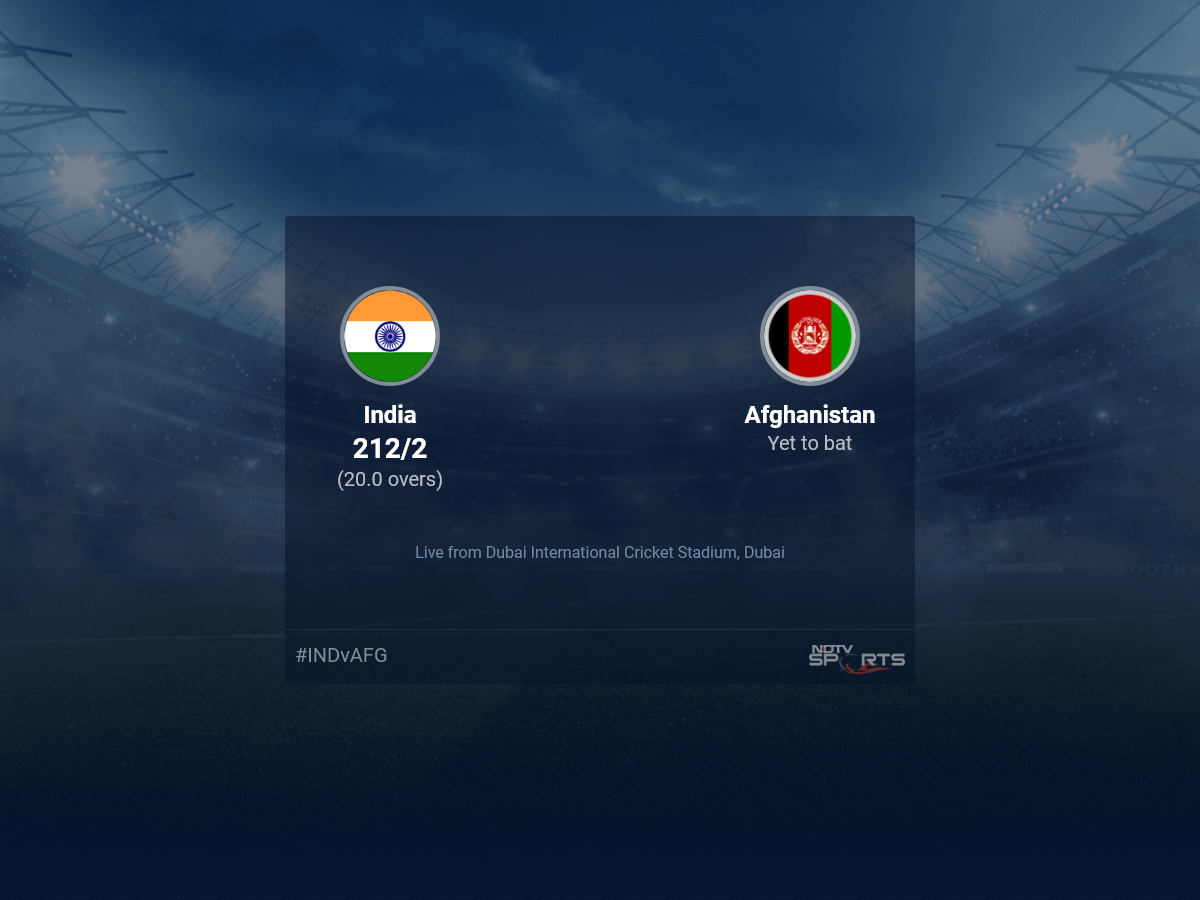A dedicated team of experts bring you live score, live cricket score, live match update on Sports.NDTV.com. After 20.0 overs, India are 212/2. The live updates of India vs Afghanistan scorecard is also available. It is the perfect platform to follow your favourite teams in Asia Cup, 2022. Keep a track on your favourite batsmen and bowlers through Asia Cup, 2022 today match, ball by ball commentary, India vs Afghanistan, India vs Afghanistan live score, India vs Afghanistan scorecard. Follow the excitement of the Asia Cup, 2022 on Sports.NDTV.com as you can follow live match updates and live cricket score through our platform.