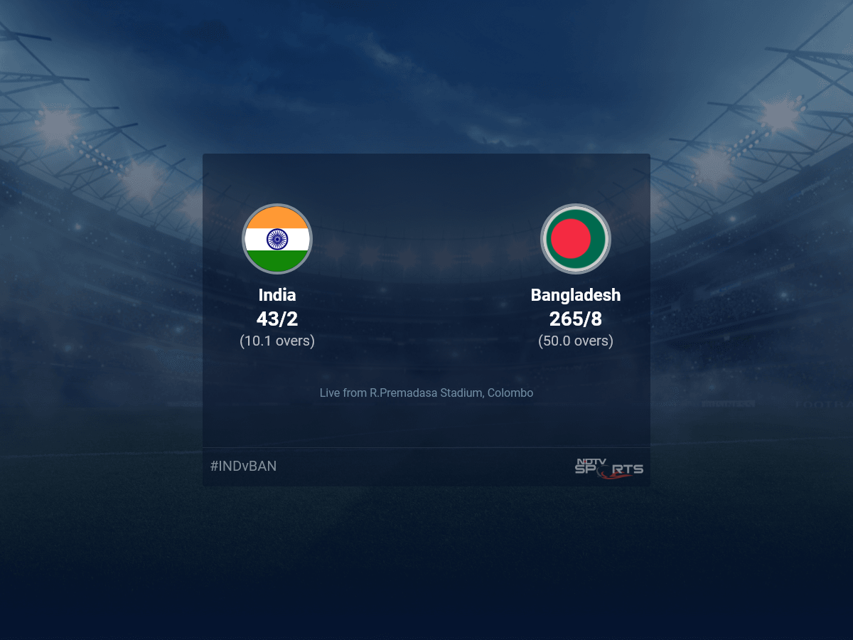 Follow the Asia Cup 2023 live cricket score on Sports.NDTV.com. After 10.1 overs, India, chasing a target of 266, are 43/2. Get live score, ball by ball commentary and much more. Keep track of Asia Cup 2023 today match between India and Bangladesh. Everything related to India and Bangladesh match will be available on Sports.NDTV.com. Stay updated with India vs Bangladesh live score. Do check for India vs Bangladesh scorecard. You can get scorecard updates, match related facts. Get quick live updates with ads, Sports.NDTV.com, which is the perfect destination for live cricket score.