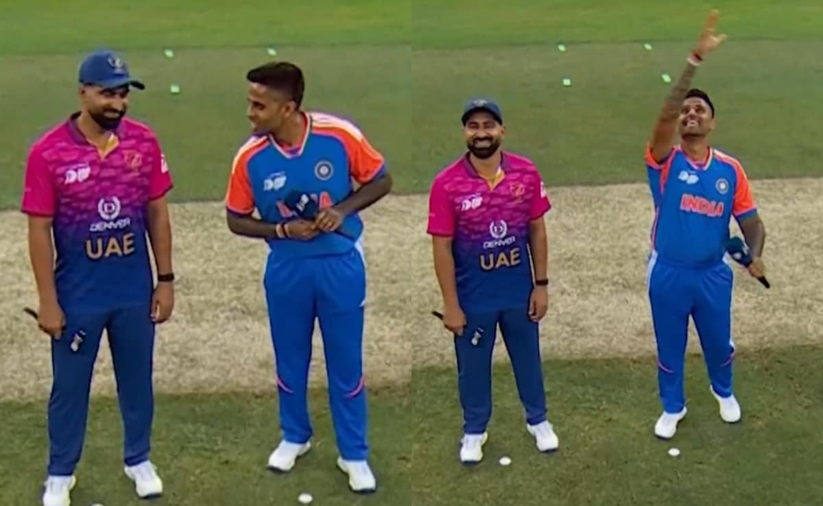 A funny moment took place right before the toss when visiting captain Suryakumar Yadav tried to hide it from UAE captain Muhammad Waseem.
