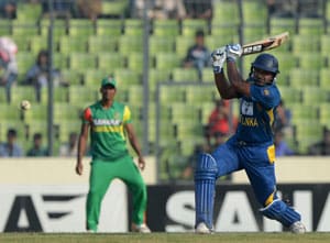 Sangakkara reached his 17th one-day century with a four through the covers off Rubel and celebrated the landmark by dabbing the next ball to third man for another boundary.