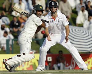Mohammad Hafeez and Taufeeq Umar fell to nothing more substantial than artfully-pitched straight balls; a substantial sandstorm could blow through the gap between Taufeeq's bat and pad. Younis Khan got a beauty from Panesar which turned to uproot his off stump. Then the old fox, Misbah, fell: a third wicket for Panesar. Misbah looked for a reprieve on DRS but the dispassionate conclusion had to be that the third umpire, Billy Bowden, was right to conclude that the ball had hit pad before bat.