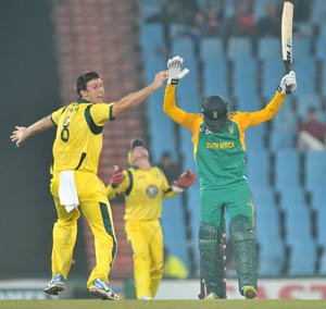 Cummins replaced Johnson at first change, and while his first ball in ODIs was slapped impudently over cover for six by Amla, the 18-year-old was soon repeating the trick of his first two Twenty20 internationals by claiming multiple wickets in an over. Jacques Kallis dragged an expansive stroke onto his stumps, before JP Duminy was dismissed for the third time in as many innings by Cummins when he parried indeterminately to Clarke at second slip.