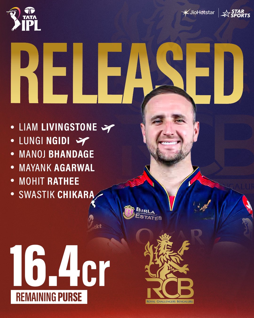 Defending champions RCB have released four overseas players, including Liam Livingstone. Blessing Muzarabani, Lungi Ngidi and Tim Seifert join him in the list. Mayank Agarwal and Swastik Chikara have been offloaded as well. They will enter the auction with a kitty of Rs 16.4 crore