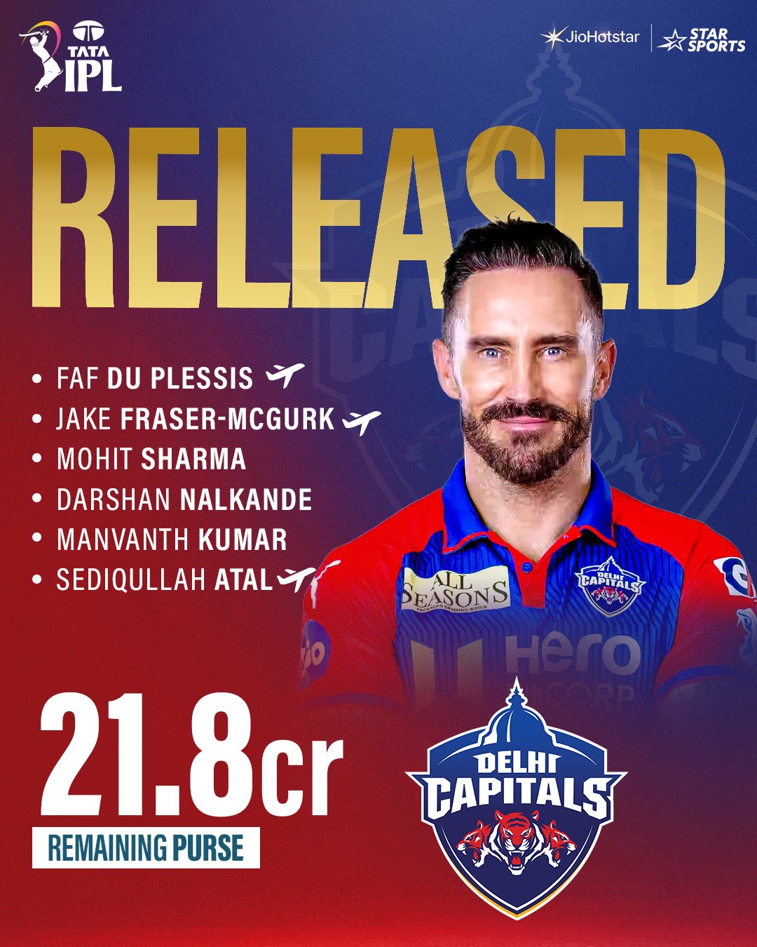 As expected, Jake Fraser-McGurk has been let go by DC. However, the big news is T Nataraj's retention. Off goes Faf du Plessis, while Donovan Ferreira was already traded to Rajasthan Royals. Sediqullah Atal, Manvanth Kumar and Darshan Nalkande have also been offloaded