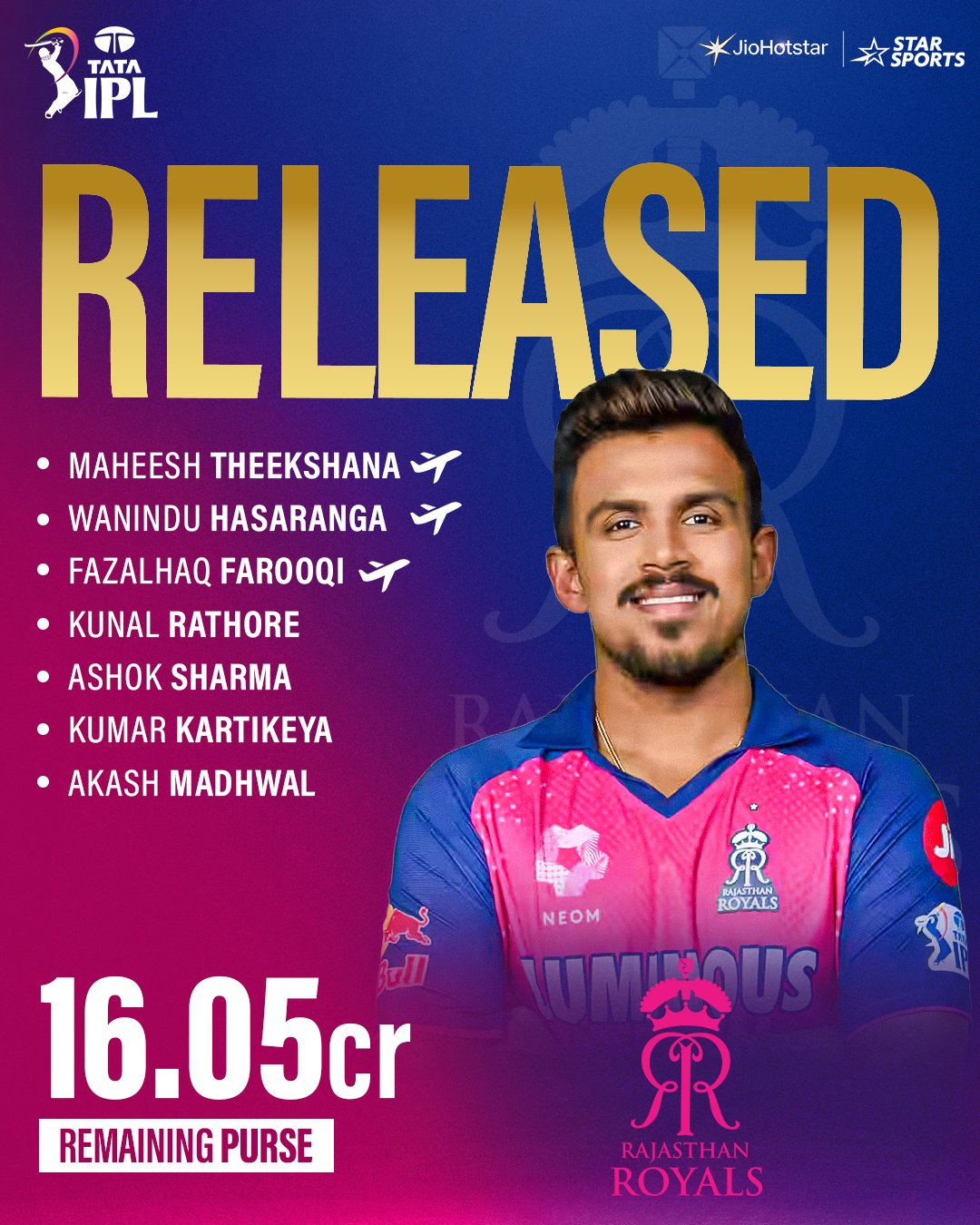 Following comprehensive evaluations and discussions, Rajasthan Royals have released Kunal Singh Rathore, Maheesh Theekshana, Wanindu Hasaranga, Fazalhaq Farooqi, Akash Madhwal, Ashok Sharma and Kumar Kartikeya. Meanwhile, Sanju Samson and Nitish Rana were traded to CSK and DC, respectively.