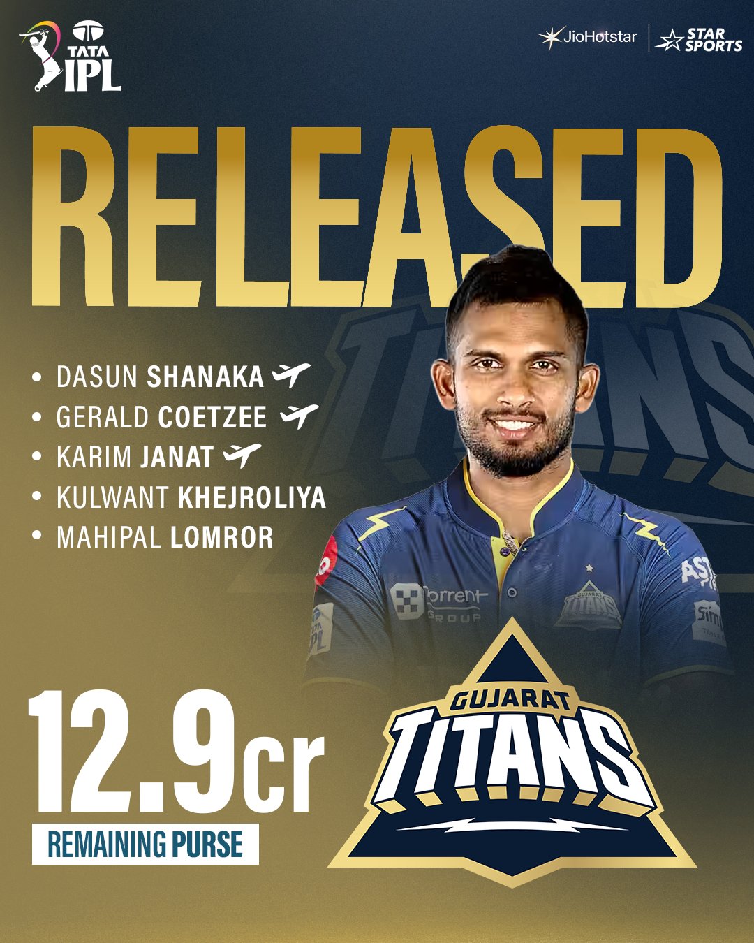 As part of the squad restructuring, Gujarat Titans have released Gerald Coetzee, Karim Janat, Mahipal Lomror, Dasun Shanaka and Kulwant Khejroliya. This comes after Sherfane Rutherford was traded to Mumbai Indians.