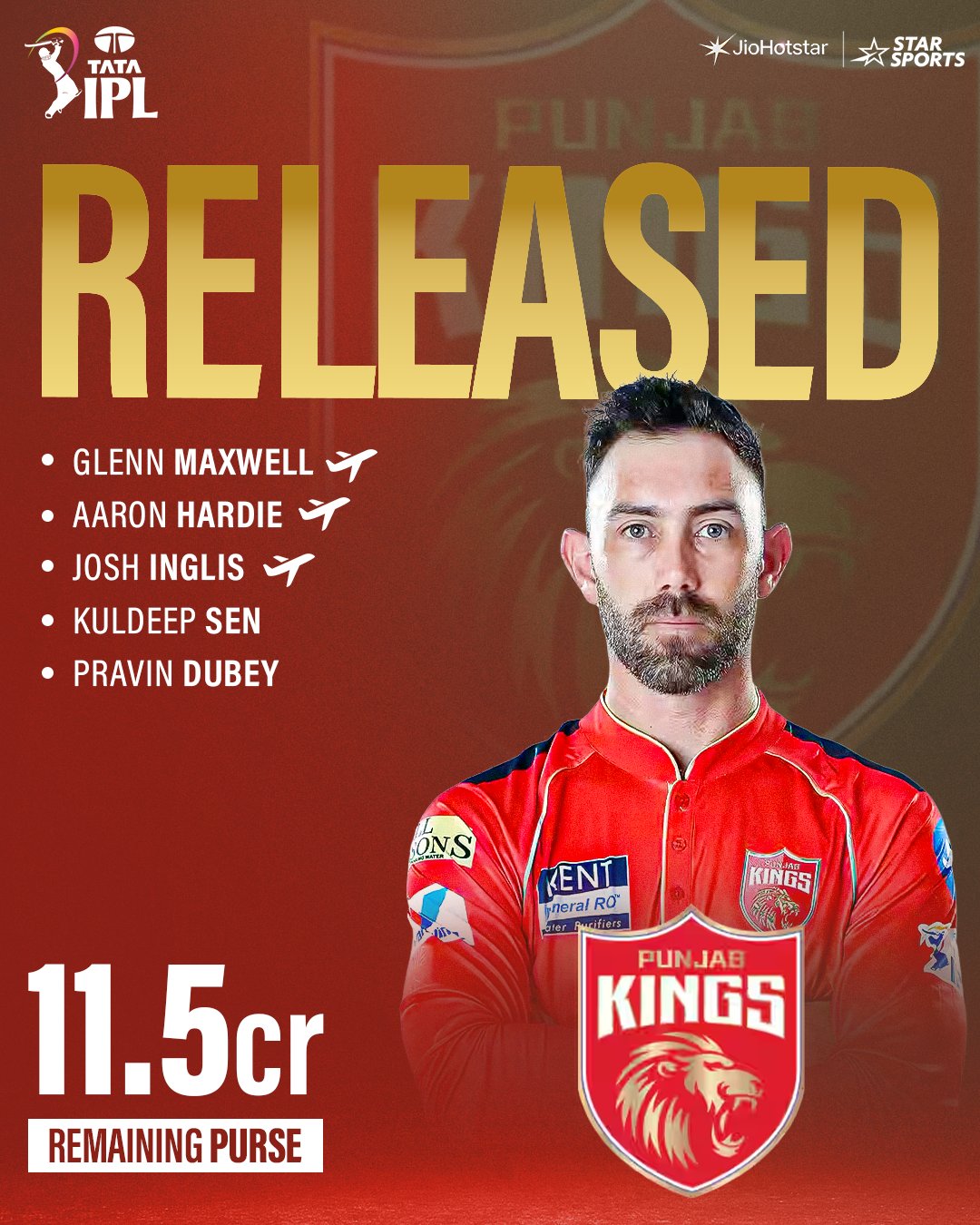 Punjab Kings have released Australian all-rounders Glenn Maxwell, Aaron Hardie and wicketerkeeper-batter Josh Inglis along with Indian domestic players Kuldeep Sen and Vishnu Vinod.