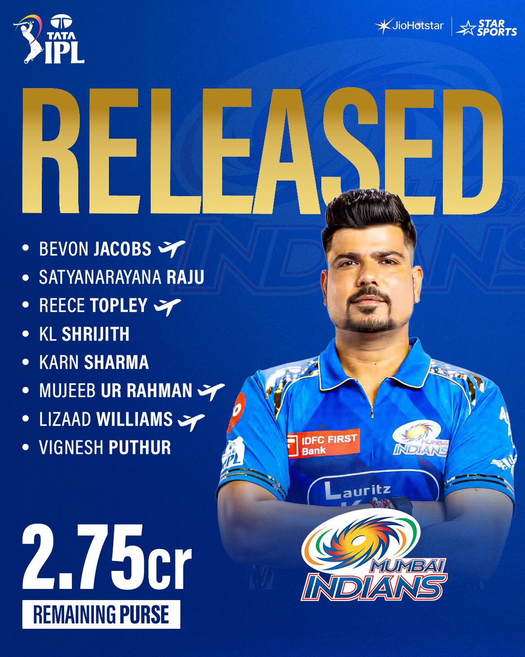 Mumbai Indians have released four overseas players, but none of them played regularly last season. Out go Lizaad Williams, Mujeeb Ur Rahman, Bevon Jacobs and Reece Topley. Vignesh Puthur, the left-arm wrist spinner, and Andhra seamer V Satyanarayana Raju are the other names. Arjun Tendulkar is also part of the list, having been traded to LSG few hours back.