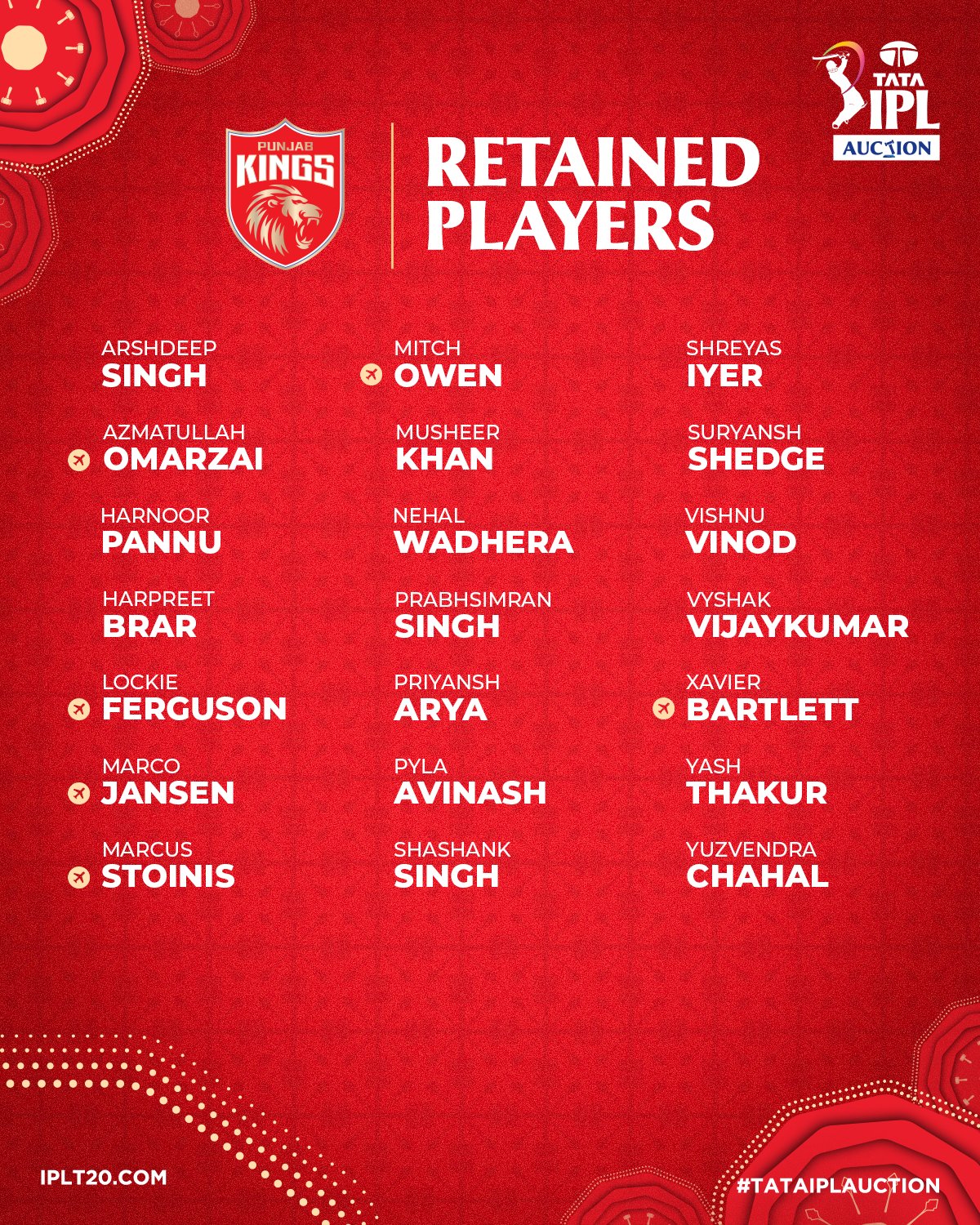 Punjab Kings are set to retain their overseas core, reports ESPNcricinfo. Among the overseas players include Marcus Stoinis, Lockie Ferguson, Marco Jansen, Josh Inglis, Azmatullah Omarzai, Xavier Bartlett and Mitchell Owen. It will be the end of the road for the likes of Glenn Maxwell, Aaron Hardie and Kyle Jamieson.