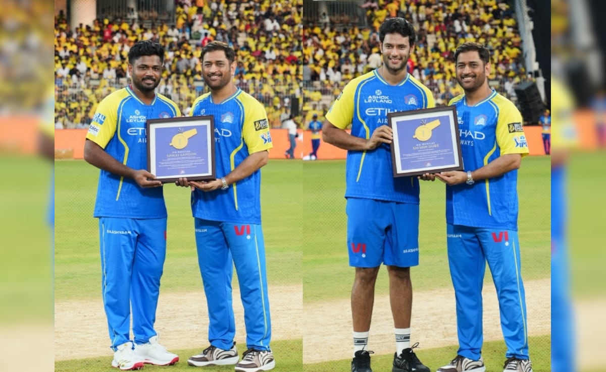 Iconic Chennai Super Kings (CSK) and India ex-captain MS Dhoni honoured T20 World Cup winners Sanju Samson, Shivam Dube, and U-19 winning captain Ayush Mhatre at a CSK pre-season fan event (ROAR 2026) in Chepauk on Sunday. Dhoni presented special mementoes to the winners during the event, which featured CSK veterans and celebrated the recent T20 World Cup success.