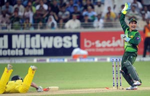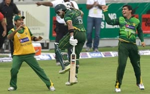 Led by Umar Akmal and Abdul Razzaq, Pakistan reached 11 on the fifth ball before Akmal hit Patrick Cummins's last delivery and just made the non-striker's ground before the throw. Akmal then pumped his fist and the team raced onto the pitch to celebrate, as the mostly Pakistan crowd of 25,000 went nuts.