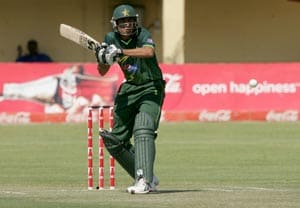 Mohammad Hafeez was unable to play his natural game and was tied down by a good opening spell from Ray Price, who constantly angled the ball into the pads. Prosper Utseya, who came on first change, bore the full brunt of Hafeez's frustration, conceding a smashed six over long-off and a lofted drive for four. Utseya had the last laugh, though. Hafeez was unable to keep the sweep down and Sibanda at square leg took the catch.