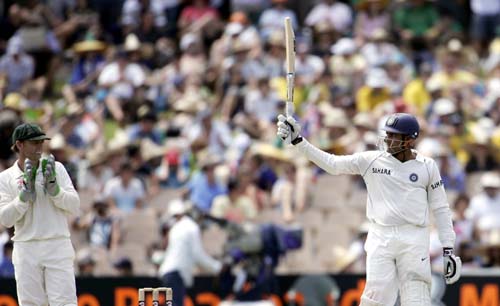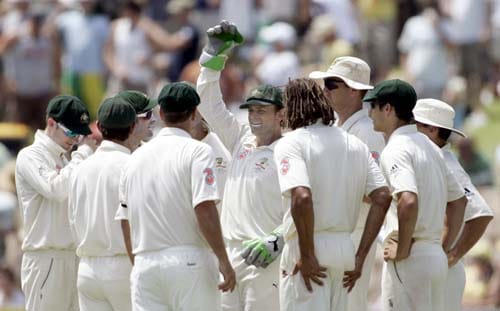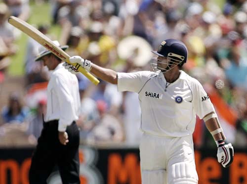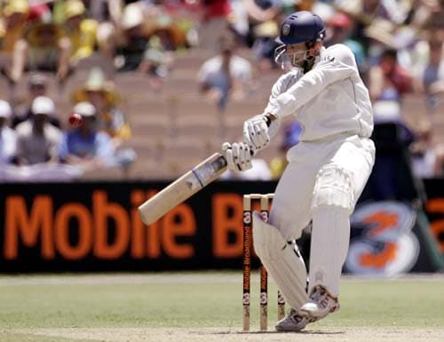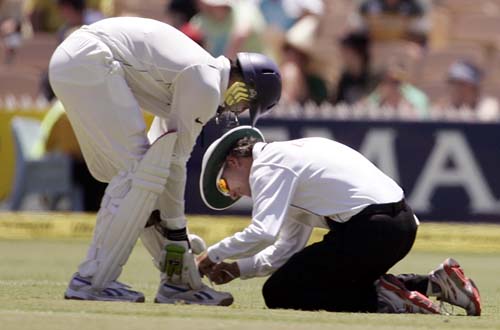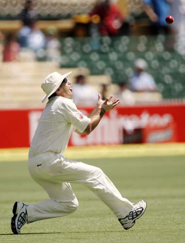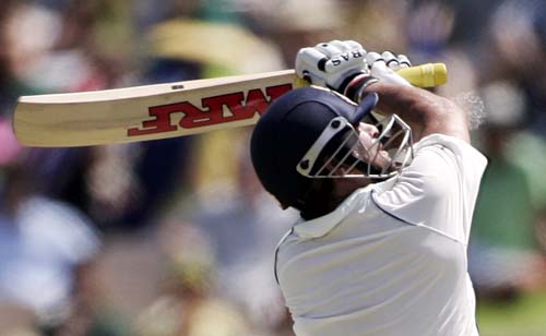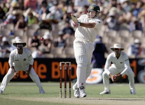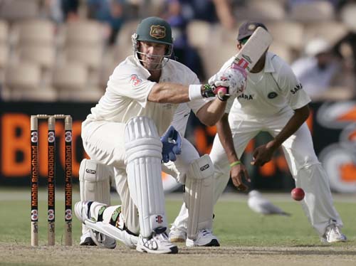 Matthew Hayden prepares to sweep against India at the Adelaide Oval on Friday, January 25, 2008, on the second day of their fourth Test. At stumps Australia are 62 for no loss in reply to India's first innings of 526.