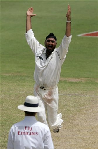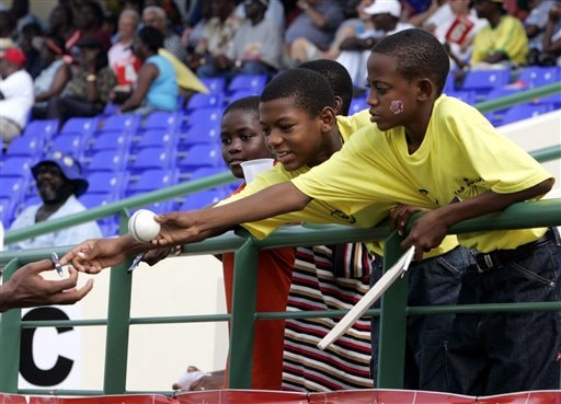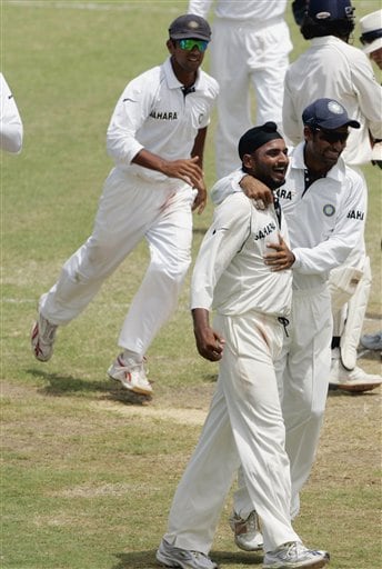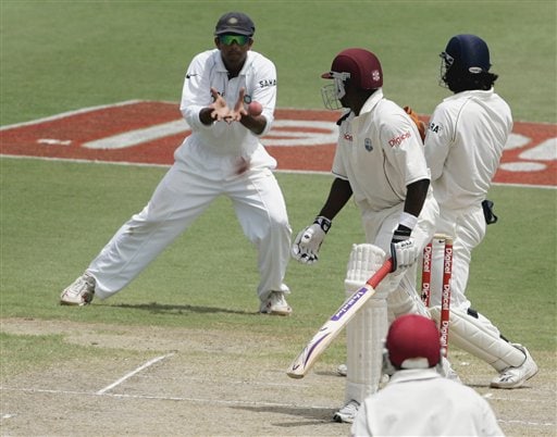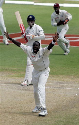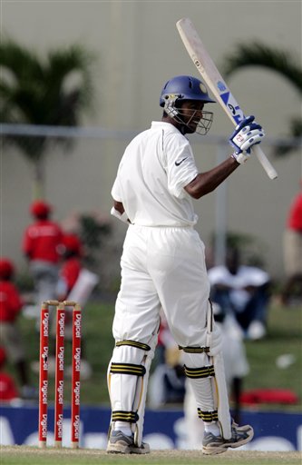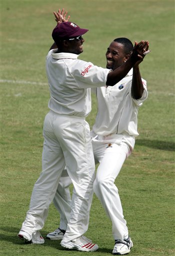 West Indies batsman Shivnarine Chanderpaul, left, walks off the field as India's Mohammad Kaif, right, puts his hand on his shoulder at the end of the West Indies' first innings on the third day of the third cricket Test match at Warner Park in Basseterre, St Kitts, Saturday, June 24, 2006. Chanderpaul fell three runs short of scoring a century as West Indies were 581 for 10. (AP Photo/Lynne Sladky)