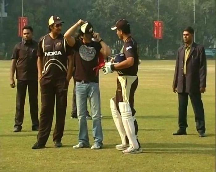 Shah Rukh Khan acknowledges the applause by his fans as Akram and Ganguly look on. SRK is in two-week conditioning camp at Eden Gardens.