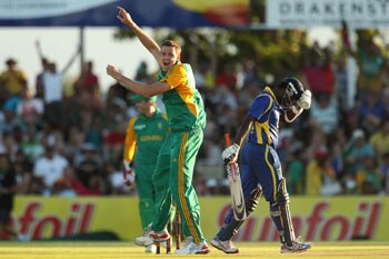 Two South African bowlers with points to prove were given the new balls and they snuffed out the resistance even before the main man Dale Steyn was called on. Morne Morkel, coming off an indifferent Test summer, started the collapse in the first over as Upul Tharanga attempted a leaden-footed slap which ended as a low catch at backward point. In the next over Lonwabo Tsotsobe, having lost his place as third seamer to Vernon Philander in the Tests, showed how potent he can be by getting the ball to jag in and rear at the batsman. That proved too much for Tillakaratne Dilshan, who also bagged a duck by gloving to the keeper.