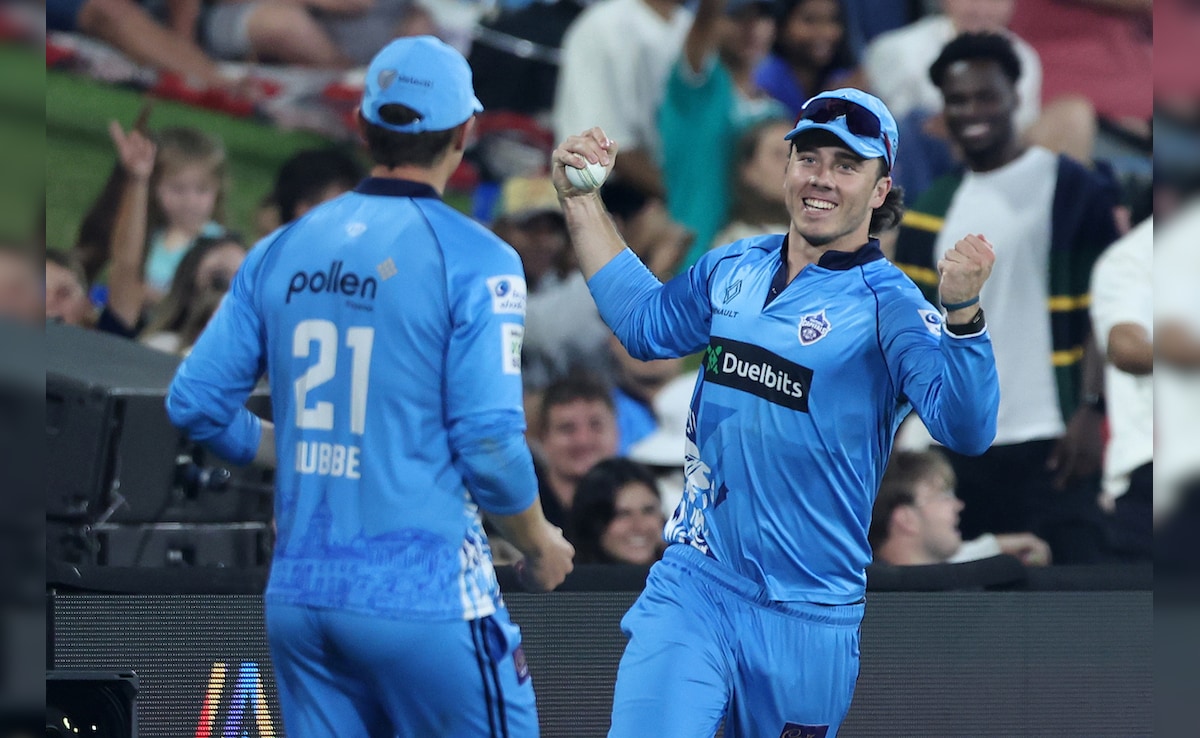 Peters (3/32) was assisted by some mind-blowing catching from Dewald Brevis in the outfield. Brevis' first grab saw him running around the boundary before clutching the ball in front of the grass banks, then lunging forward in a full-stretch dive to secure a sensational catch just inches from the turf two balls later.