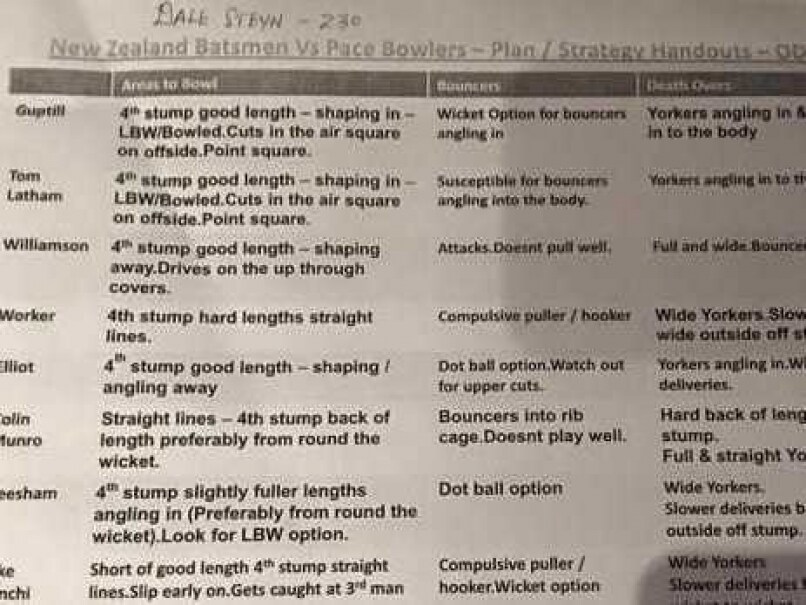 A guest at a Sandton hotel posted an image on Facebook showing how South Africa planned to attack each of the Kiwi batsmen in Wednesday's first one-day international at Centurion.