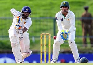 New man Angelo Mathews began with a promising on-drive off Mohammad Sami for four, but fell for nine when he sliced Junaid to Asad Shafiq at gully.