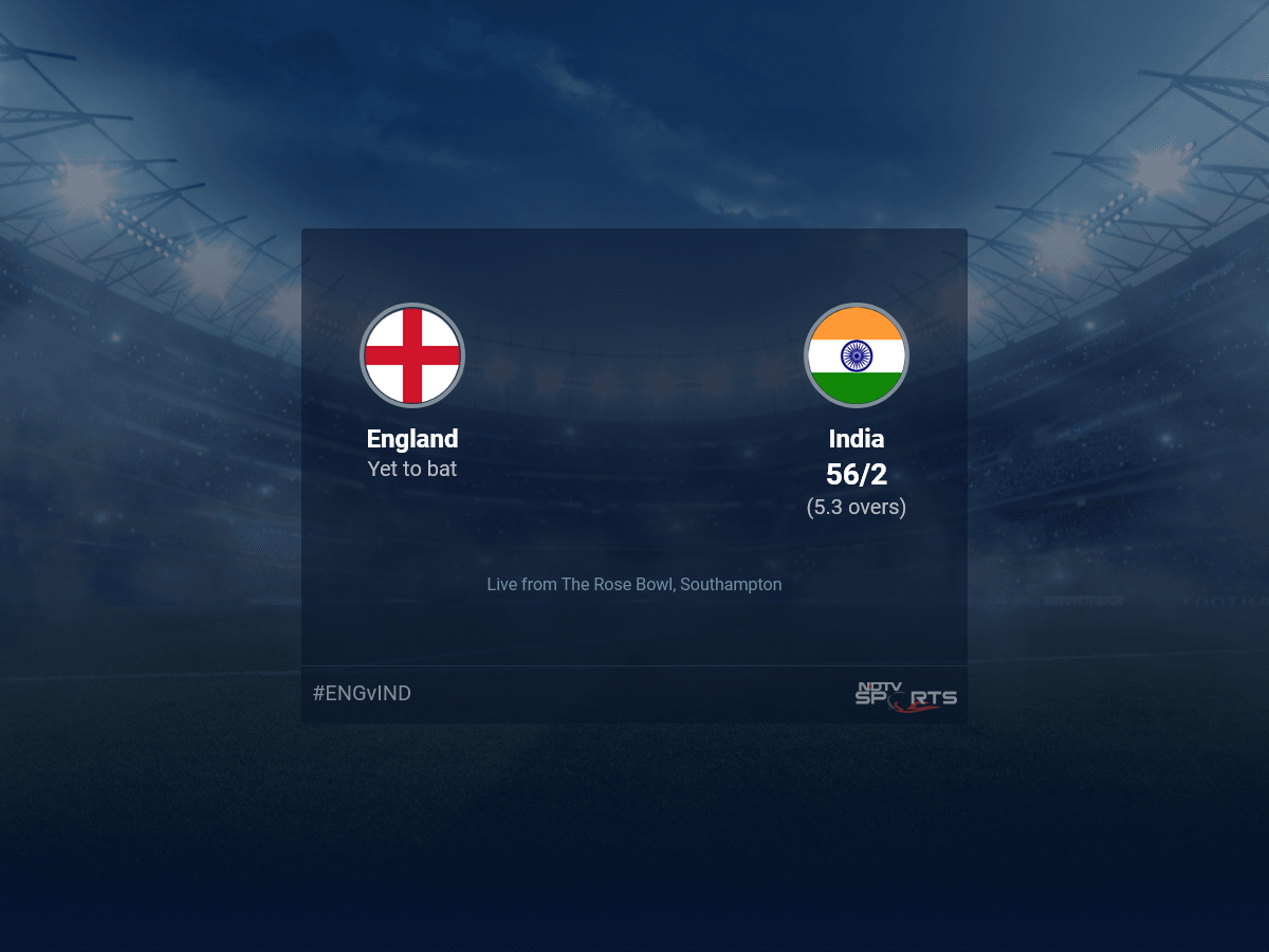 Follow the England vs India, 2022 live cricket score on Sports.NDTV.com. After 5.3 overs, India are 56/2. Get live score, ball by ball commentary and much more. Keep track of England vs India, 2022 today match between England and India. Everything related to England and India match will be available on Sports.NDTV.com. Stay updated with England vs India live score. Do check for England vs India scorecard. You can get scorecard updates, match related facts. Get quick live updates with ads, Sports.NDTV.com, which is the perfect destination for live cricket score.