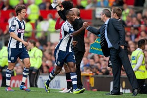 On-loan Marseille winger Morgan Amalfitano put West Brom ahead with an exquisite individual goal in the 54th minute, picking the ball up on halfway and nutmegging Rio Ferdinand before insouciantly dinking the ball over goalkeeper David de Gea.