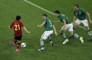 Controlling the ball 12 yards out, the nippy Spain midfielder faced a seemingly impenetrable wall of three Ireland defenders blocking his route to goal. So he improvised, dancing right then left before hitting the ball with pinpoint precision past one defender, through the legs of two others, and beyond goalkeeper Shay Given. It was Spain's second goal in a 4-0 Group C win on June 14. Laser-like.