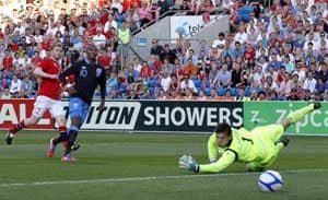 England goalkeeper Rob Green - making his first start since his blunder against the United States at the 2010 World Cup - was forced into a nervous save moments later when he tipped Markus Henriksen's shot wide.