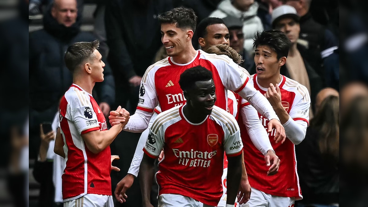 Arsenal held on for a pulsating 3-2 win over arch rivals Tottenham in the north London derby to keep their grip on top spot in the Premier League on Sunday. Bidding to stay one step ahead of Manchester City in the title race, Mikel Arteta's side silenced the Tottenham Hotspur Stadium with a three-goal blast before half-time. Pierre-Emile Hojbjerg's own goal put Arsenal ahead before Bukayo Saka and Kai Havertz netted to leave Arsenal in complete control. Cristian Romero and Son Heung-min struck for Tottenham after the interval to set up a nervous finish, but Arsenal clung on by their finger tips.