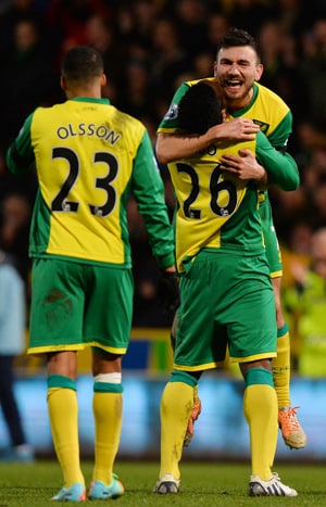 Tottenham had an opportunity to trim Liverpool's advantage back to three points at Carrow Road, but it was Norwich who claimed victory thanks to a 47th-minute strike by Robert Snodgrass (celebrating in pic).
