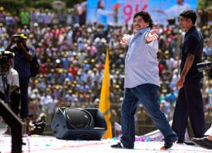 Then came rolling, one after the another, over a dozen footballs towards Maradona. Each was rocketed into the crowds. But not before the icon manoeuvred them deftly to amuse his fans.