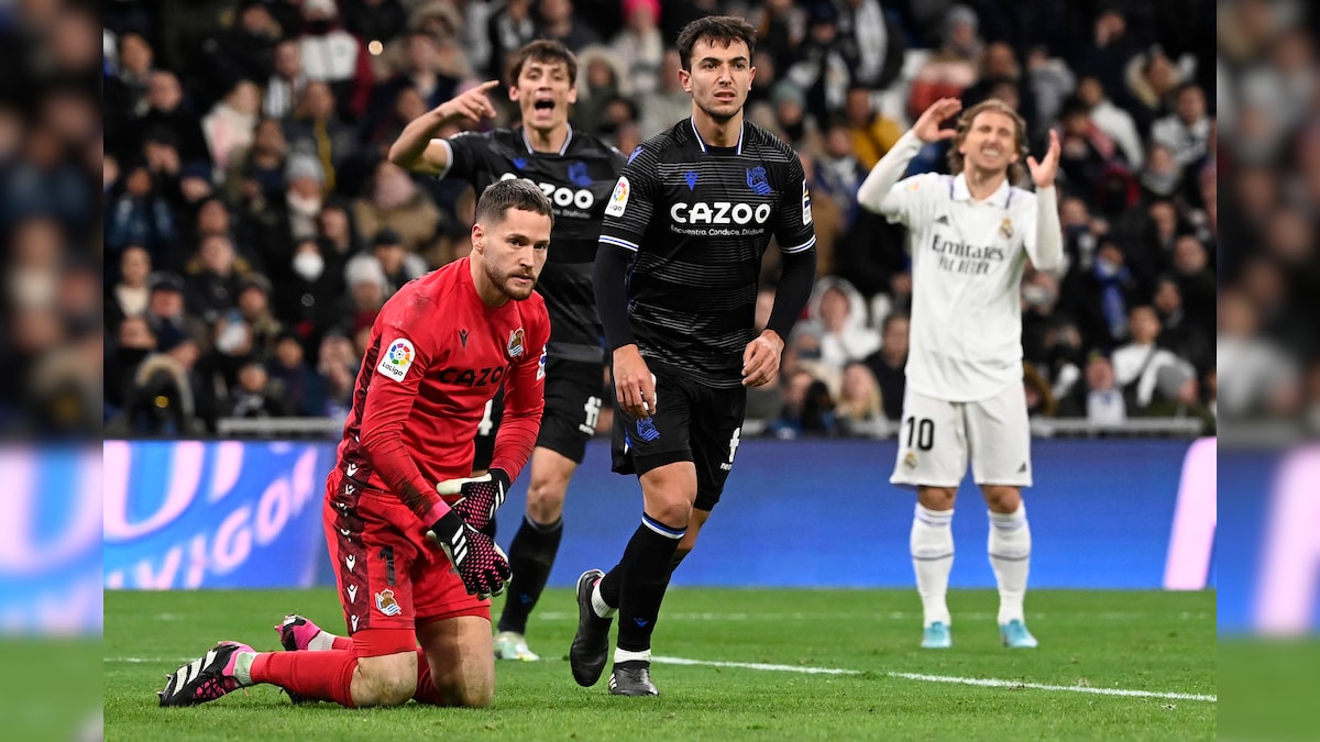 Real Sociedad goalkeeper Alex Remiro made a string of fine saves to frustrate Real Madrid in a 0-0 draw Sunday, leaving Barcelona five points clear at the top of La Liga. After the Catalans beat Girona on Saturday Madrid needed to win to stay three points behind their rivals in the title race, but Remiro ensured otherwise, keeping third-place La Real on the champions' tail. Vinicius Junior had three good chances repelled by Remiro among other Madrid openings, as Carlo Ancelotti's side sparkled but failed to find the goal their performance deserved.