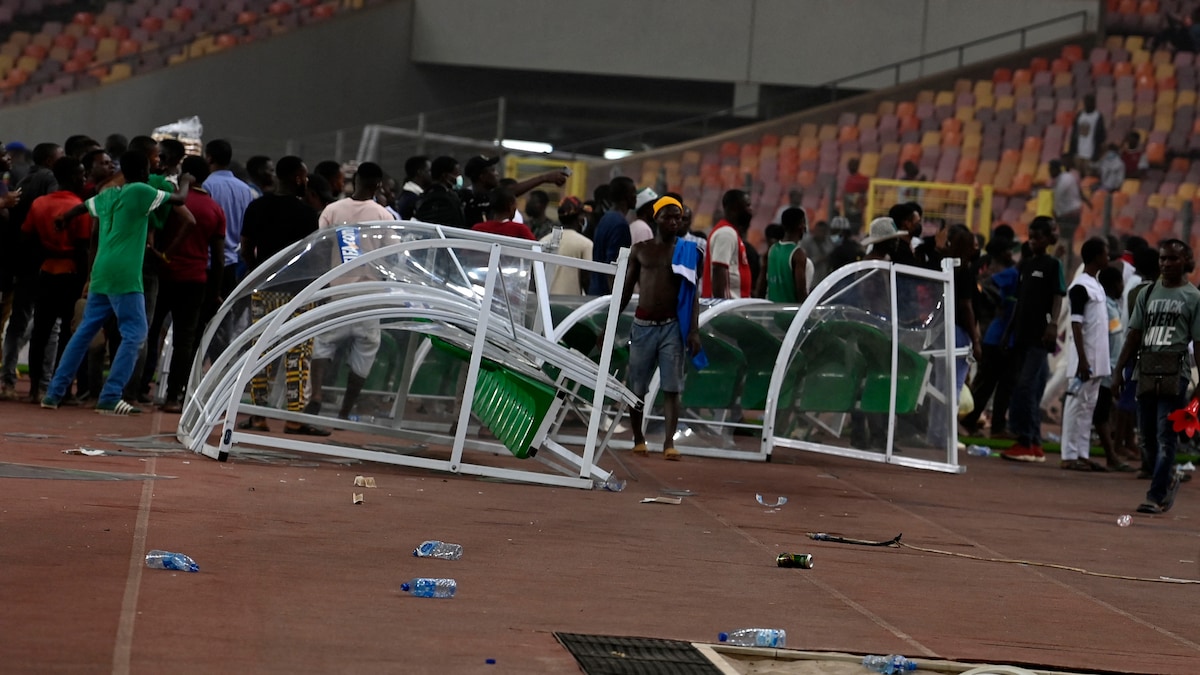 Some of fans smashed benches while others chanted "Pinnick must go! Pinnick must go!!", referring to the president of the Nigeria Football Federation (NFF), Amaju Pinnick.