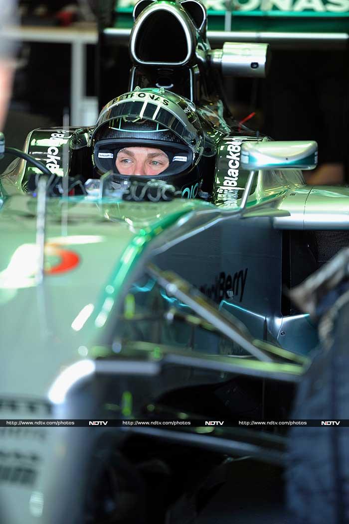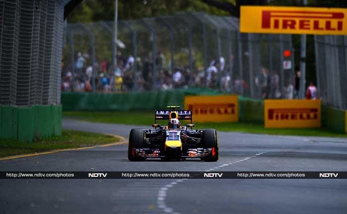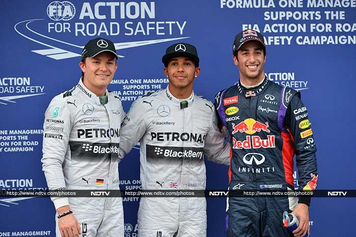 Mercedes' Lewis Hamilton (center) took pole position while Red Bull debutant Daniel Ricciardo (right) came second and Nico Rosberg finished with the third quickest time.