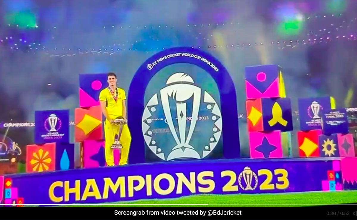 As has been the tradition, the captain lifts the trophy, with his teammates right behind him. But, on Sunday, Cummins had to wait for his teammates to join him on the stage. Here's the video: