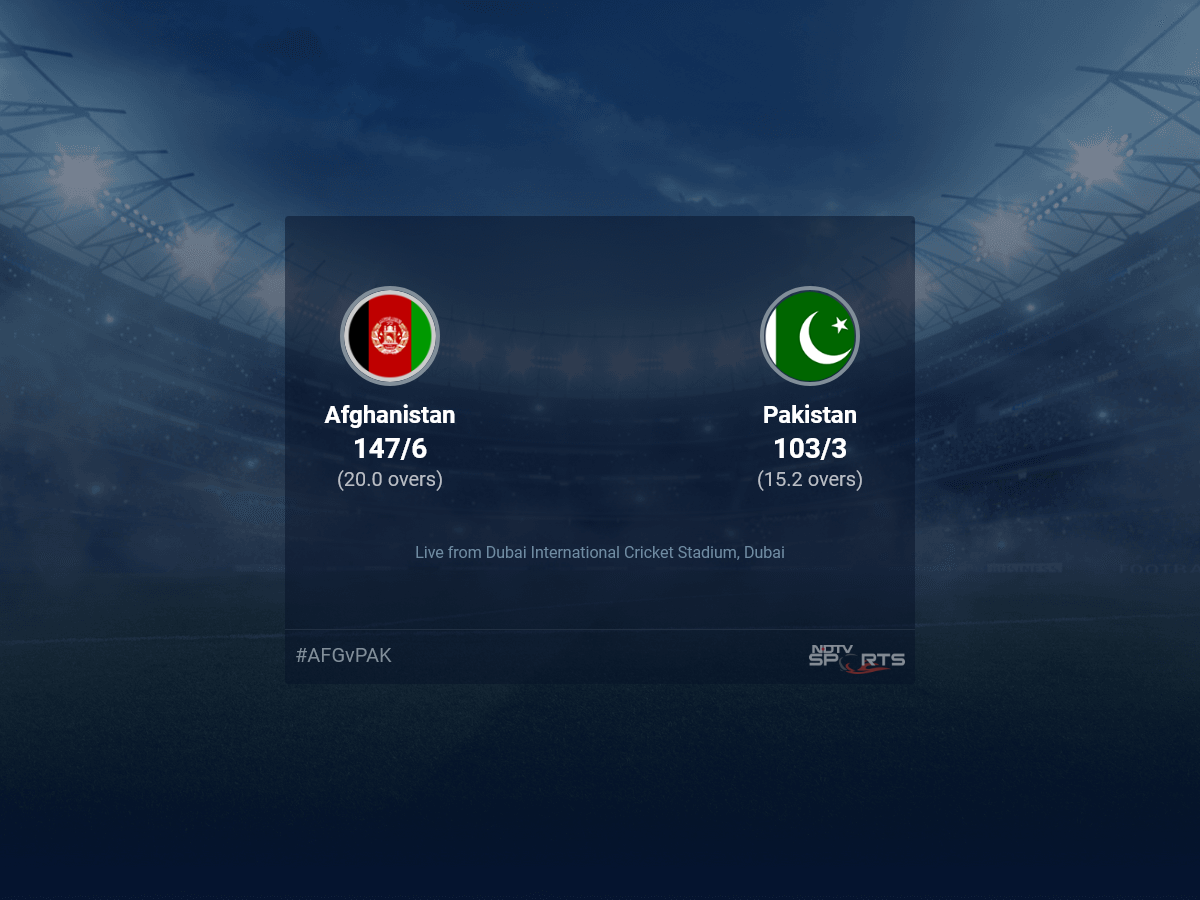 Follow the ICC T20 World Cup 2021 live cricket score on Sports.NDTV.com. After 15.2 overs, Pakistan, chasing a target of 148, are 103/3. Get live score, ball by ball commentary and much more. Keep track of ICC T20 World Cup 2021 today match between Afghanistan and Pakistan. Everything related to Afghanistan and Pakistan match will be available on Sports.NDTV.com. Stay updated with Afghanistan vs Pakistan live score. Do check for Afghanistan vs Pakistan scorecard. You can get scorecard updates, match related facts. Get quick live updates with ads, Sports.NDTV.com, which is the perfect destination for live cricket score.