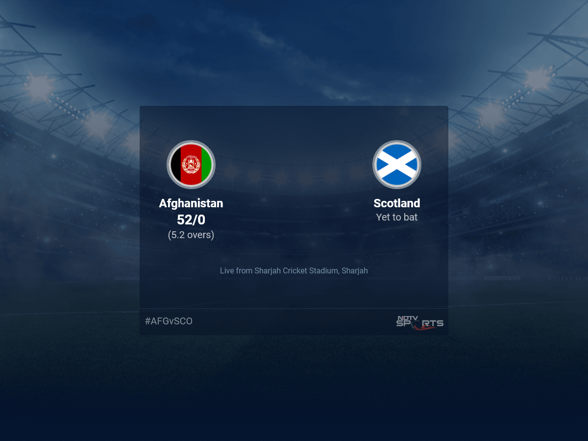 A dedicated team of experts bring you live score, live cricket score, live match update on Sports.NDTV.com. After 5.2 overs, Afghanistan are 52/0. The live updates of Afghanistan vs Scotland scorecard is also available. It is the perfect platform to follow your favourite teams in ICC T20 World Cup 2021. Keep a track on your favourite batsmen and bowlers through ICC T20 World Cup 2021 today match, ball by ball commentary, Afghanistan vs Scotland, Afghanistan vs Scotland live score, Afghanistan vs Scotland scorecard. Follow the excitement of the ICC T20 World Cup 2021 on Sports.NDTV.com as you can follow live match updates and live cricket score through our platform.