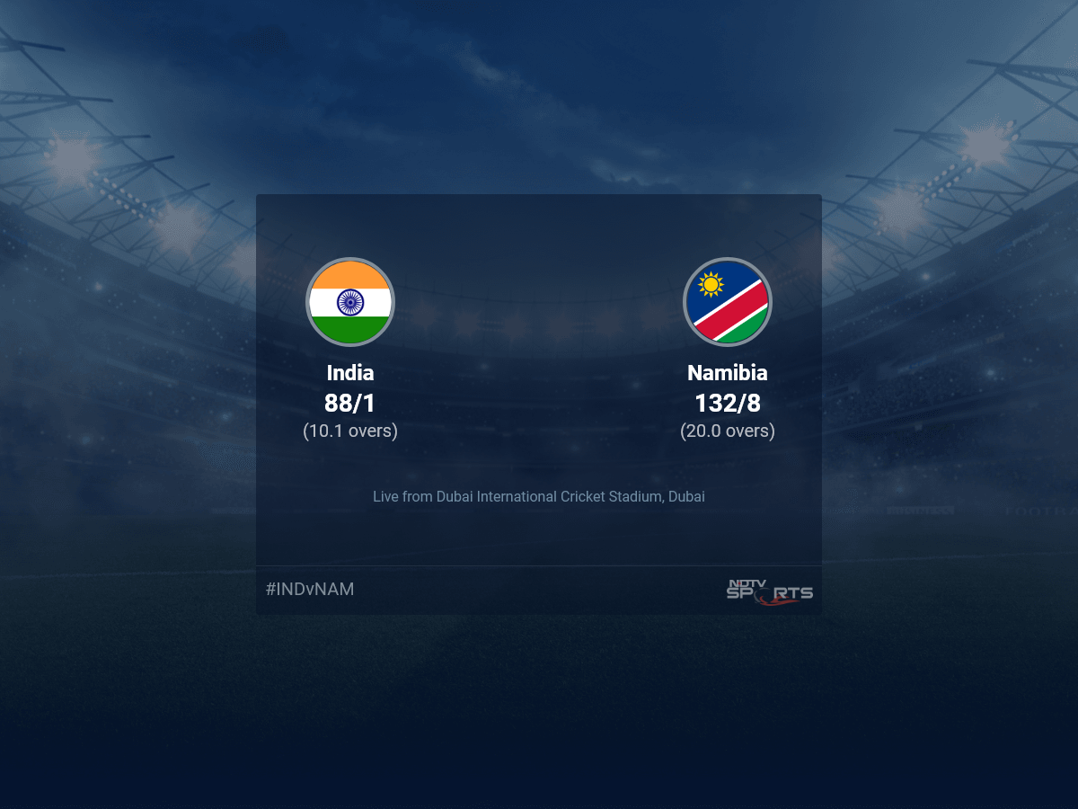 Follow the ICC T20 World Cup 2021 live cricket score on Sports.NDTV.com. After 10.1 overs, India, chasing a target of 133, are 88/1. Get live score, ball by ball commentary and much more. Keep track of ICC T20 World Cup 2021 today match between India and Namibia. Everything related to India and Namibia match will be available on Sports.NDTV.com. Stay updated with India vs Namibia live score. Do check for India vs Namibia scorecard. You can get scorecard updates, match related facts. Get quick live updates with ads, Sports.NDTV.com, which is the perfect destination for live cricket score.