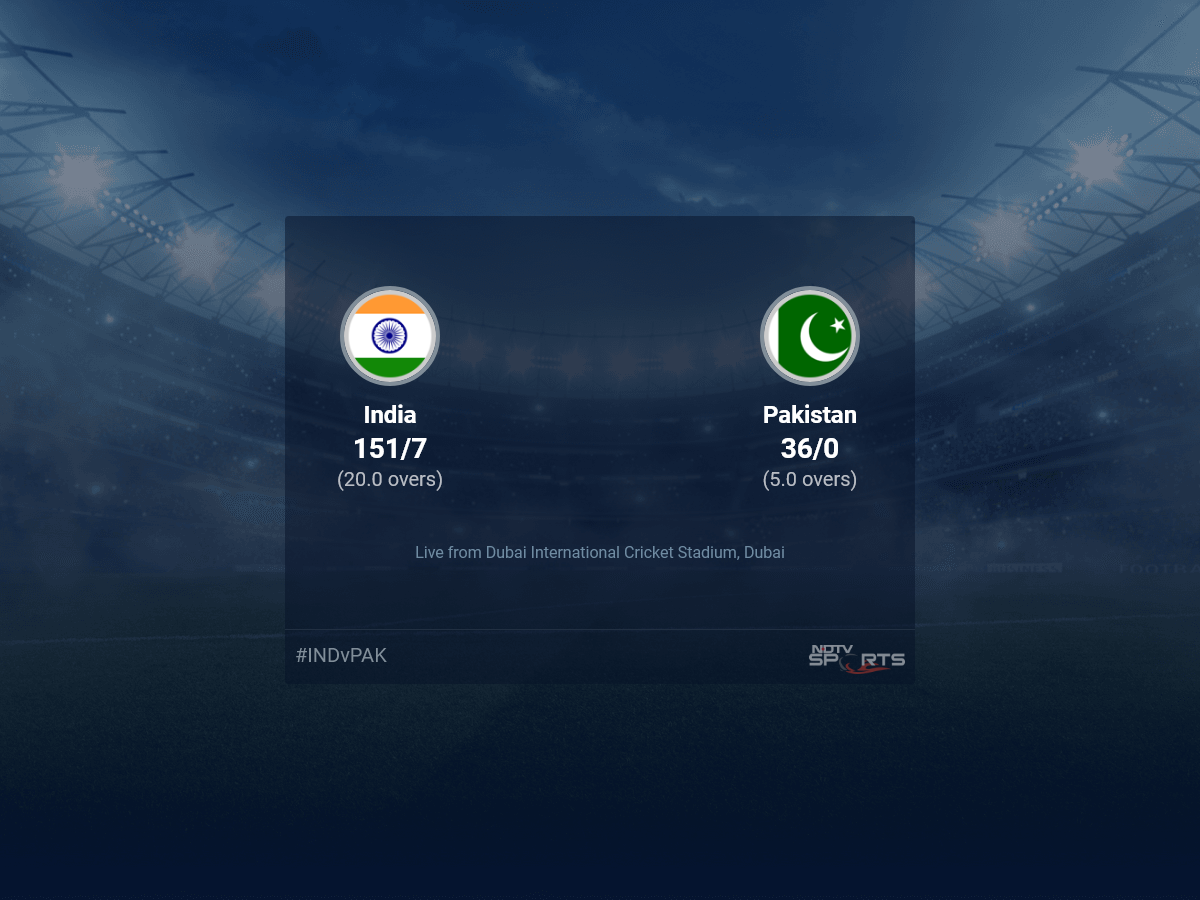 A dedicated team of experts bring you live score, live cricket score, live match update on Sports.NDTV.com. After 5.0 overs, Pakistan, chasing a target of 152, are 36/0. The live updates of India vs Pakistan scorecard is also available. It is the perfect platform to follow your favourite teams in ICC T20 World Cup 2021. Keep a track on your favourite batsmen and bowlers through ICC T20 World Cup 2021 today match, ball by ball commentary, India vs Pakistan, India vs Pakistan live score, India vs Pakistan scorecard. Follow the excitement of the ICC T20 World Cup 2021 on Sports.NDTV.com as you can follow live match updates and live cricket score through our platform.