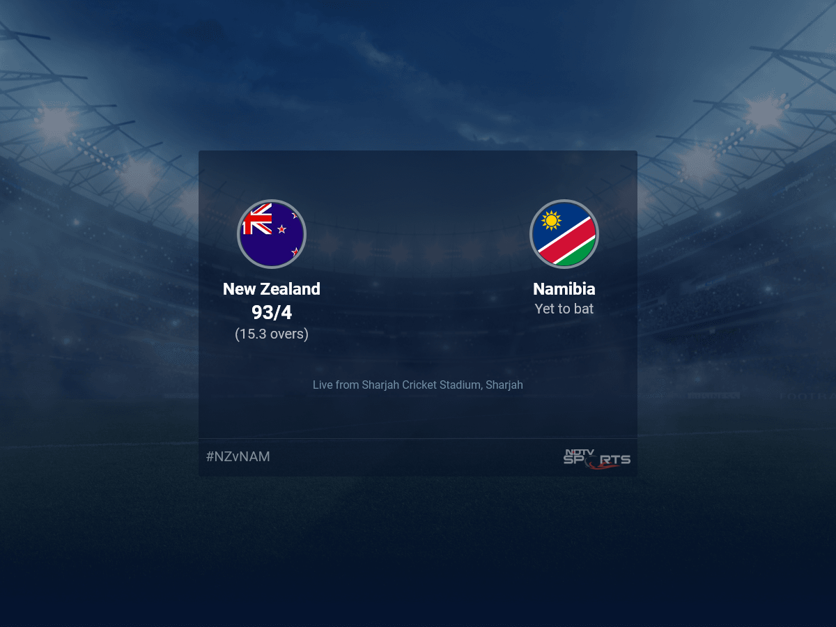 A dedicated team of experts bring you live score, live cricket score, live match update on Sports.NDTV.com. After 15.3 overs, New Zealand are 93/4. The live updates of New Zealand vs Namibia scorecard is also available. It is the perfect platform to follow your favourite teams in ICC T20 World Cup 2021. Keep a track on your favourite batsmen and bowlers through ICC T20 World Cup 2021 today match, ball by ball commentary, New Zealand vs Namibia, New Zealand vs Namibia live score, New Zealand vs Namibia scorecard. Follow the excitement of the ICC T20 World Cup 2021 on Sports.NDTV.com as you can follow live match updates and live cricket score through our platform.