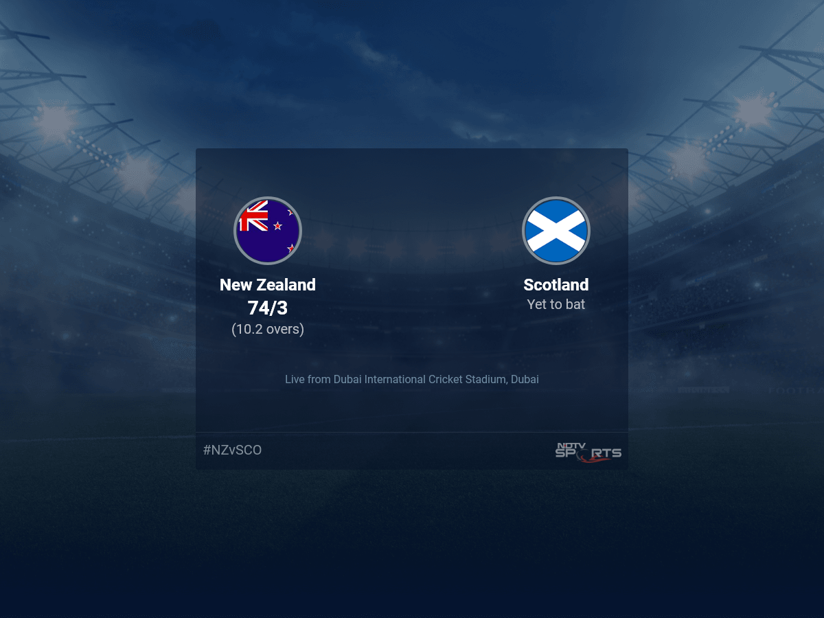 Follow the ICC T20 World Cup 2021 live cricket score on Sports.NDTV.com. After 10.2 overs, New Zealand are 74/3. Get live score, ball by ball commentary and much more. Keep track of ICC T20 World Cup 2021 today match between New Zealand and Scotland. Everything related to New Zealand and Scotland match will be available on Sports.NDTV.com. Stay updated with New Zealand vs Scotland live score. Do check for New Zealand vs Scotland scorecard. You can get scorecard updates, match related facts. Get quick live updates with ads, Sports.NDTV.com, which is the perfect destination for live cricket score.