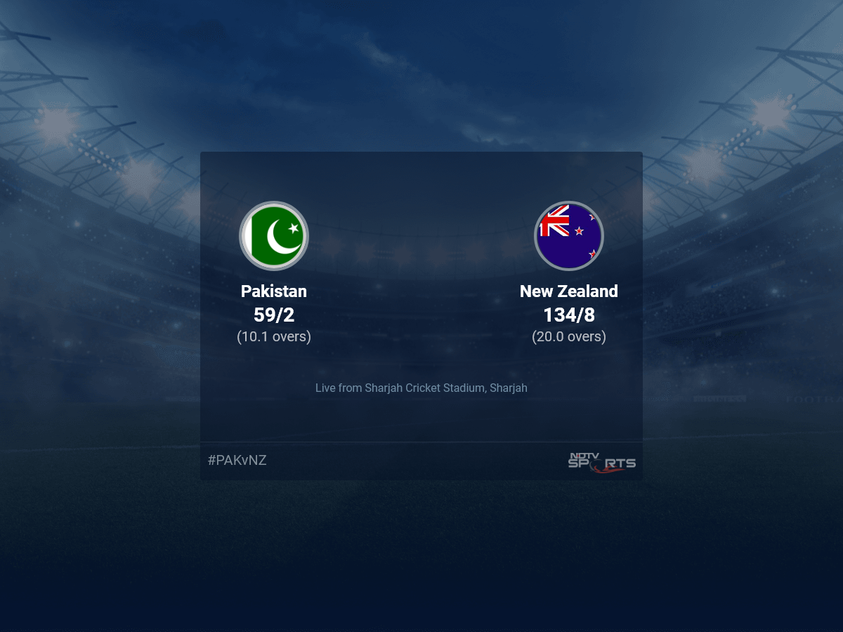 Follow the ICC T20 World Cup 2021 live cricket score on Sports.NDTV.com. After 10.1 overs, Pakistan, chasing a target of 135, are 59/2. Get live score, ball by ball commentary and much more. Keep track of ICC T20 World Cup 2021 today match between Pakistan and New Zealand. Everything related to Pakistan and New Zealand match will be available on Sports.NDTV.com. Stay updated with Pakistan vs New Zealand live score. Do check for Pakistan vs New Zealand scorecard. You can get scorecard updates, match related facts. Get quick live updates with ads, Sports.NDTV.com, which is the perfect destination for live cricket score.