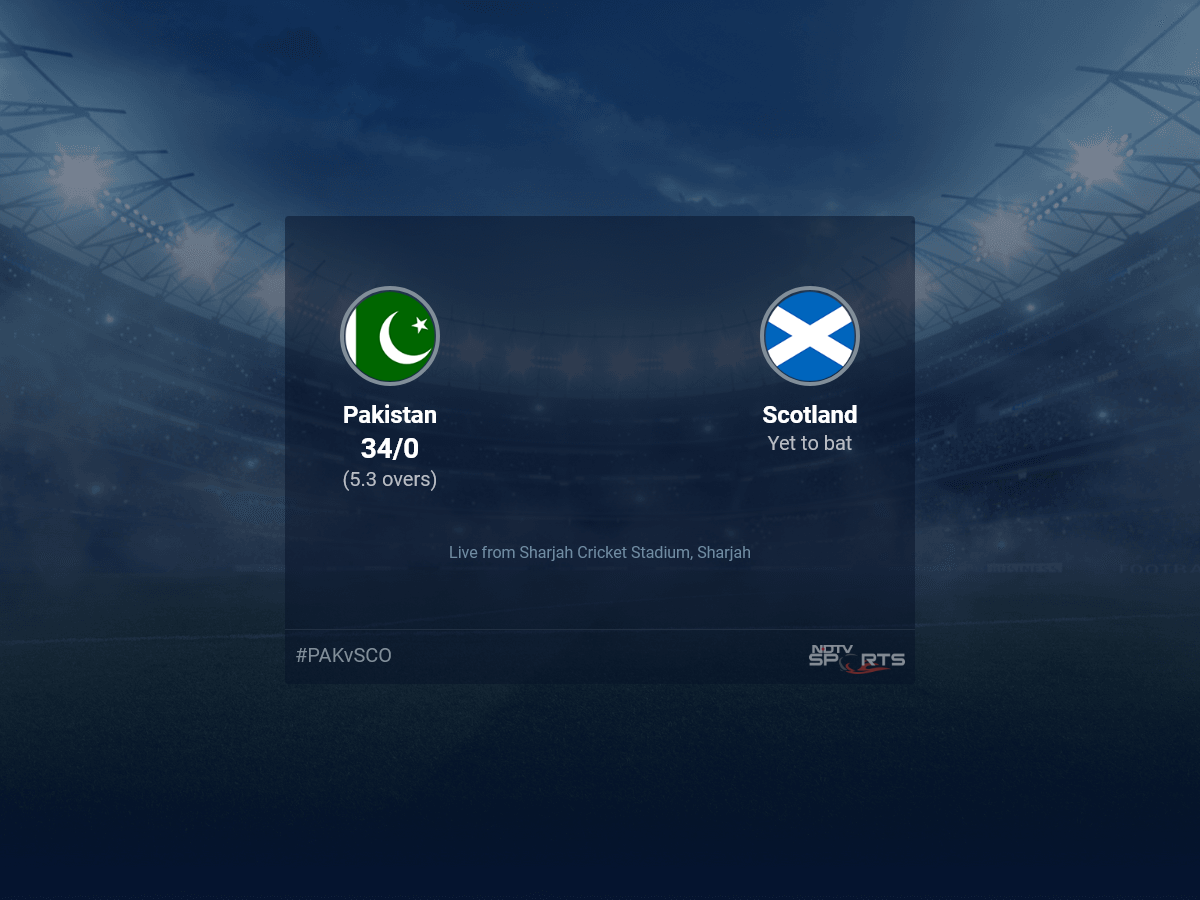A dedicated team of experts bring you live score, live cricket score, live match update on Sports.NDTV.com. After 5.3 overs, Pakistan are 34/0. The live updates of Pakistan vs Scotland scorecard is also available. It is the perfect platform to follow your favourite teams in ICC T20 World Cup 2021. Keep a track on your favourite batsmen and bowlers through ICC T20 World Cup 2021 today match, ball by ball commentary, Pakistan vs Scotland, Pakistan vs Scotland live score, Pakistan vs Scotland scorecard. Follow the excitement of the ICC T20 World Cup 2021 on Sports.NDTV.com as you can follow live match updates and live cricket score through our platform.