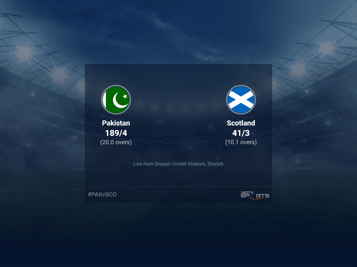 Follow the ICC T20 World Cup 2021 live cricket score on Sports.NDTV.com. After 10.1 overs, Scotland, chasing a target of 190, are 41/3. Get live score, ball by ball commentary and much more. Keep track of ICC T20 World Cup 2021 today match between Pakistan and Scotland. Everything related to Pakistan and Scotland match will be available on Sports.NDTV.com. Stay updated with Pakistan vs Scotland live score. Do check for Pakistan vs Scotland scorecard. You can get scorecard updates, match related facts. Get quick live updates with ads, Sports.NDTV.com, which is the perfect destination for live cricket score.