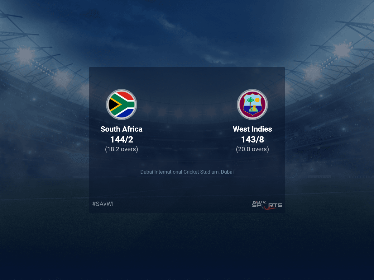 A dedicated team of experts bring you live score, live cricket score, live match update on Sports.NDTV.com. After 18.2 overs, South Africa, chasing a target of 144, are 144/2. The live updates of South Africa vs West Indies scorecard is also available. It is the perfect platform to follow your favourite teams in ICC T20 World Cup 2021. Keep a track on your favourite batsmen and bowlers through ICC T20 World Cup 2021 today match, ball by ball commentary, South Africa vs West Indies, South Africa vs West Indies live score, South Africa vs West Indies scorecard. Follow the excitement of the ICC T20 World Cup 2021 on Sports.NDTV.com as you can follow live match updates and live cricket score through our platform.