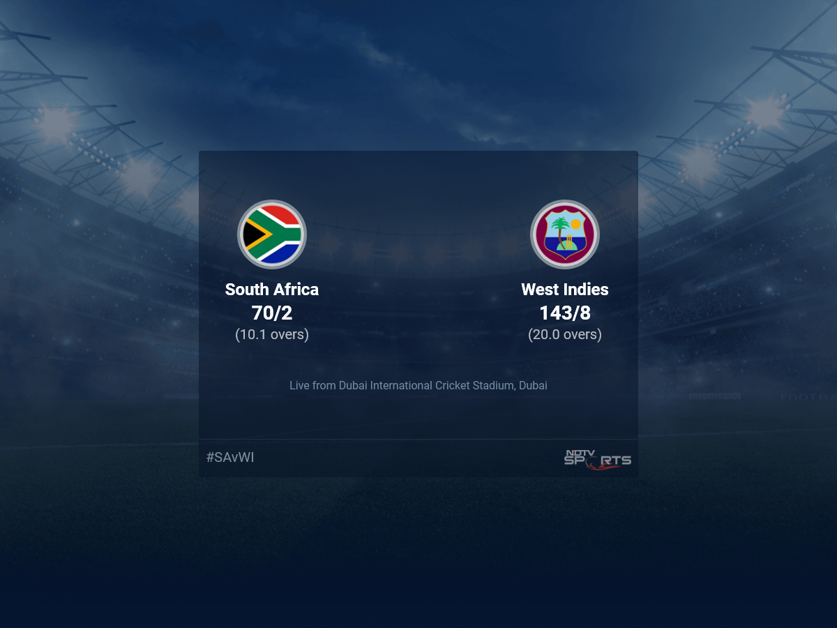 A dedicated team of experts bring you live score, live cricket score, live match update on Sports.NDTV.com. After 10.1 overs, South Africa, chasing a target of 144, are 70/2. The live updates of South Africa vs West Indies scorecard is also available. It is the perfect platform to follow your favourite teams in ICC T20 World Cup 2021. Keep a track on your favourite batsmen and bowlers through ICC T20 World Cup 2021 today match, ball by ball commentary, South Africa vs West Indies, South Africa vs West Indies live score, South Africa vs West Indies scorecard. Follow the excitement of the ICC T20 World Cup 2021 on Sports.NDTV.com as you can follow live match updates and live cricket score through our platform.