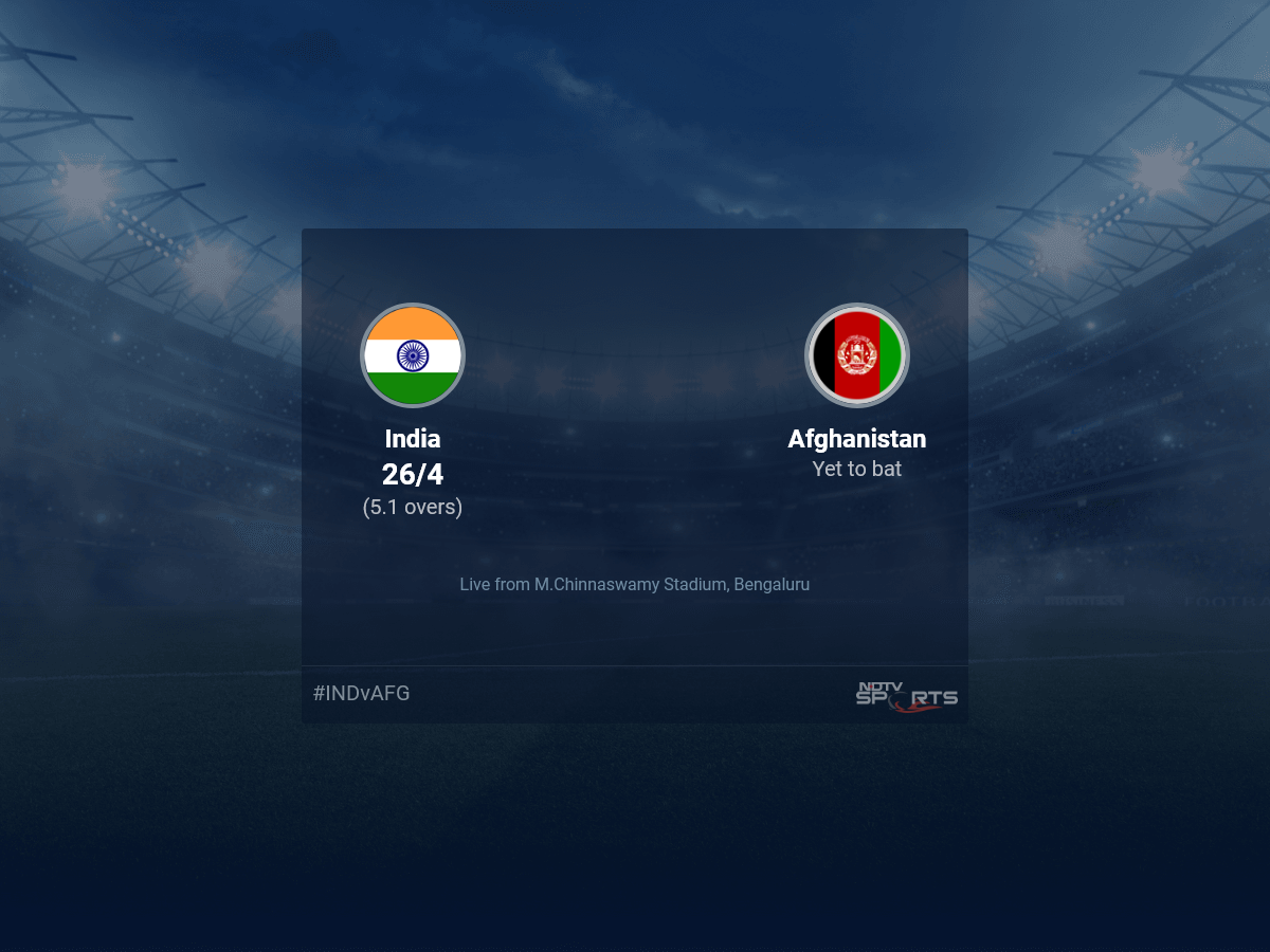 Follow the India vs Afghanistan, T20I 2024 live cricket score on Sports.NDTV.com. After 5.1 overs, India are 26/4. Get live score, ball by ball commentary and much more. Keep track of India vs Afghanistan, T20I 2024 today match between India and Afghanistan. Everything related to India and Afghanistan match will be available on Sports.NDTV.com. Stay updated with India vs Afghanistan live score. Do check for India vs Afghanistan scorecard. You can get scorecard updates, match related facts. Get quick live updates with ads, Sports.NDTV.com, which is the perfect destination for live cricket score.