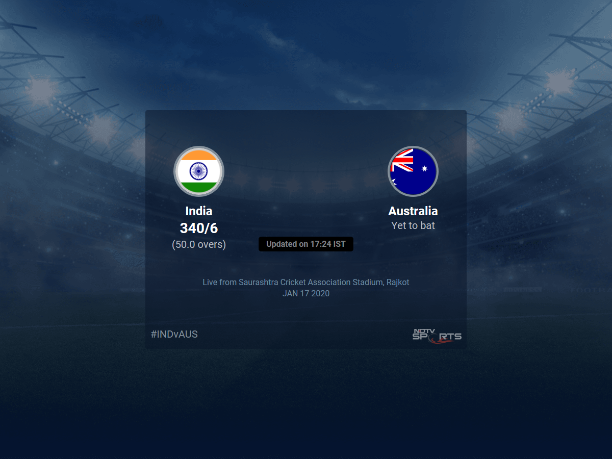 Follow the India vs Australia 2019/20 live cricket score on Sports.NDTV.com. After 50.0 overs, India are 340/6. Get live score, ball by ball commentary and much more. Keep track of India vs Australia 2019/20 today match between India and Australia. Everything related to India and Australia match will be available on Sports.NDTV.com. Stay updated with India vs Australia live score. Do check for India vs Australia scorecard. You can get scorecard updates, match related facts. Get quick live updates with ads, Sports.NDTV.com, which is the perfect destination for live cricket score.