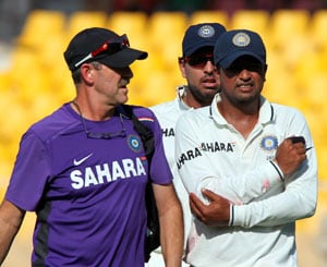 literally plumb lbw in the 24th over. Ojha almost also gave India a major scare when diving on an Ashwin delivery, he landed awkwardly on his arm.