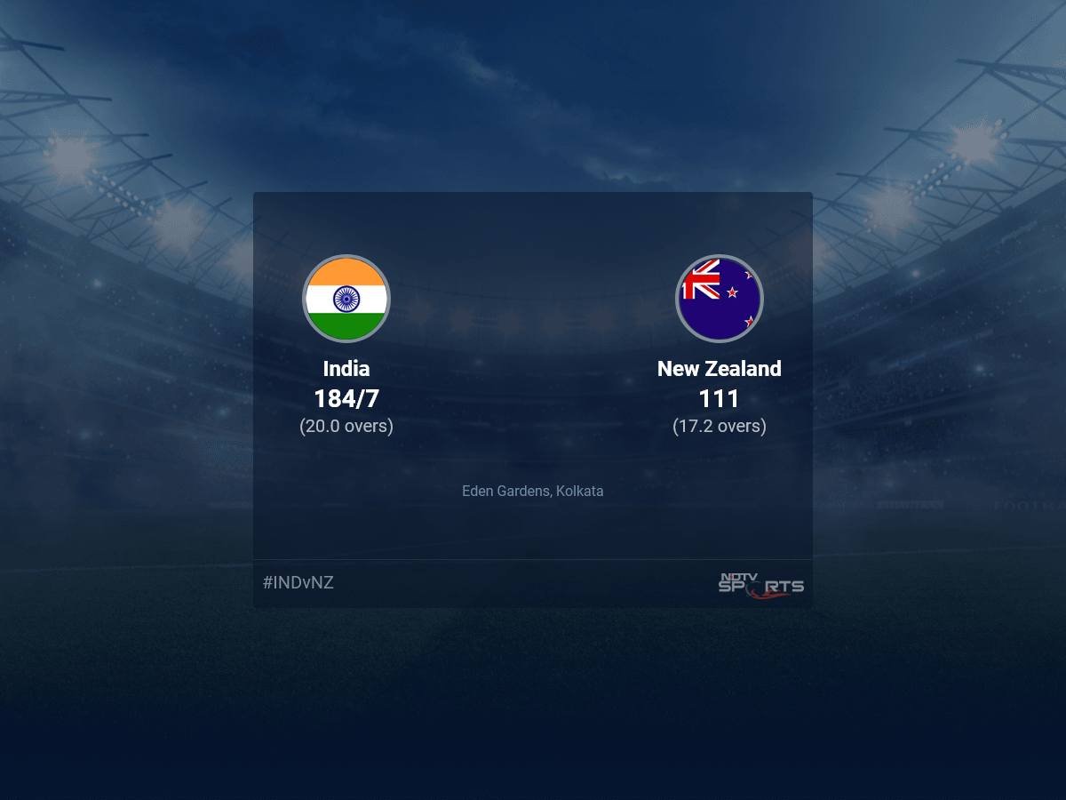 Follow the India vs New Zealand 2021 live cricket score on Sports.NDTV.com. After 17.2 overs, New Zealand, chasing a target of 185, are 111. Get live score, ball by ball commentary and much more. Keep track of India vs New Zealand 2021 today match between India and New Zealand. Everything related to India and New Zealand match will be available on Sports.NDTV.com. Stay updated with India vs New Zealand live score. Do check for India vs New Zealand scorecard. You can get scorecard updates, match related facts. Get quick live updates with ads, Sports.NDTV.com, which is the perfect destination for live cricket score.